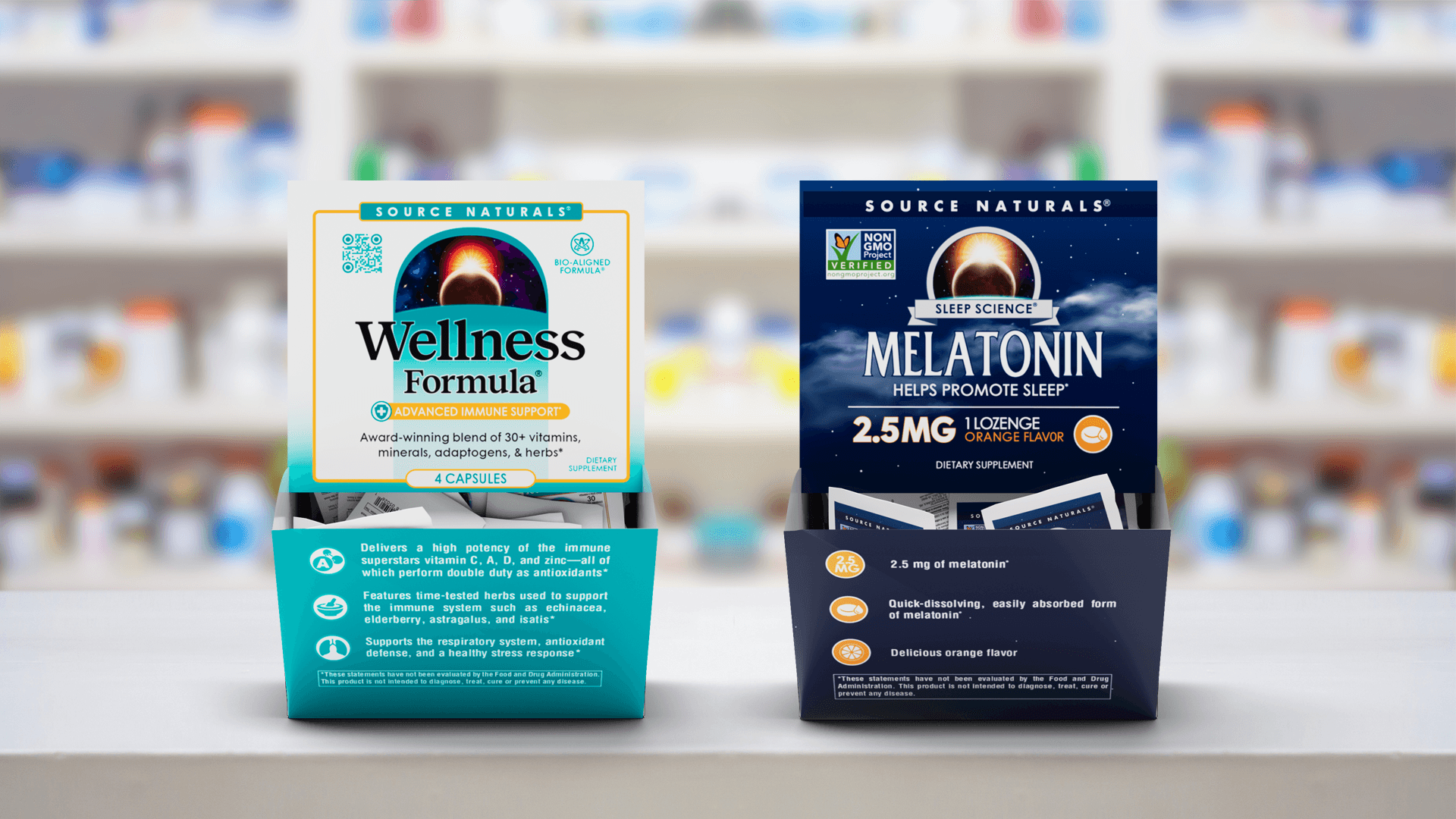 I created a new counter display box for Source Naturals®’ single-serving sachets, converting what were previously free giveaways with no measurable ROI into a sellable, revenue-generating product. This approach established a dual-channel model, maintaining free samples for awareness while adding a low-cost, retail-ready format that encouraged impulse purchases. With a 30-count configuration, the displays provided a new point of entry into channels such as convenience stores, hotels, campus shops, small gyms, wellness centers, and larger retail chains with travel or checkout sections. Sales reps were provided with AR visualization tools to help retailers see how displays would look in-store. The Wellness Formula counter display will be on track to be the #1 highest selling SKU of the entire portfolio by EOY 2026.
